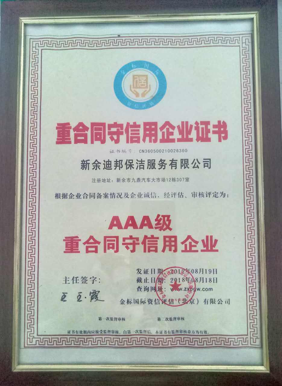 新余迪邦保潔服務(wù)有限公司獲得北京金標(biāo)國際資信有限公司評為AAA級重合同守信用企業(yè)